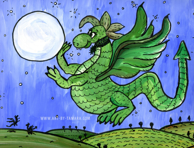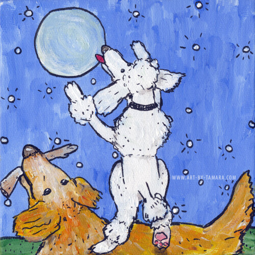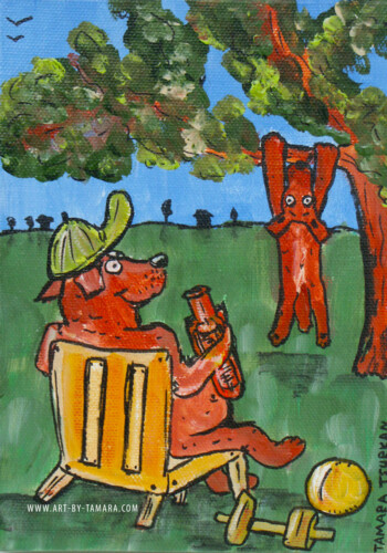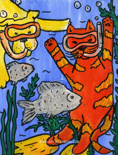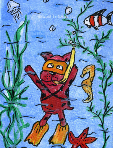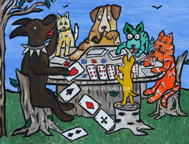 fairytale-like stories that depict animals in unique and non-standard way. The characters of my folk art are animals (dogs, cats, cows, sheep and others) involved in various unusual activities (climbing to the moon, flying, scuba-diving, dancing, playing cards).